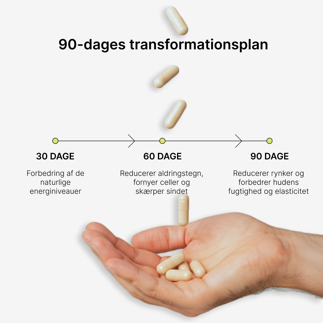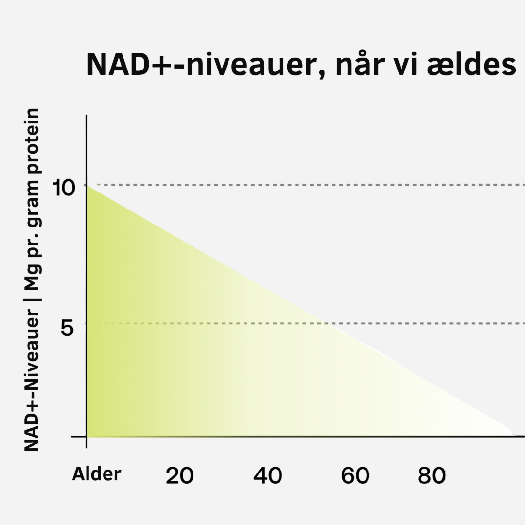 Når du når middelalderen, kan dine NAD+-niveauer være faldet med 50 % – hvilket fører til hurtigere aldring, lav energi og hjernetåge. NAD+ er afgørende for over 400 processer i kroppen, herunder kollagenproduktion til huden, energiproduktion og DNA-reparation.